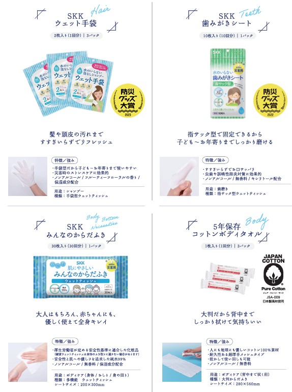 • 水の無い災害時でも、すすぎ不要で全身をキレイにできるウェットティッシュ4種セット